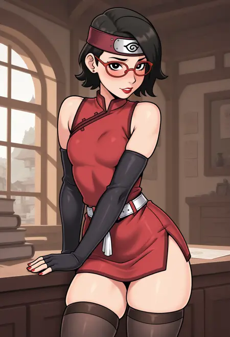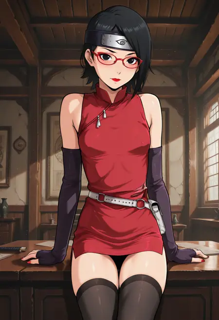 outfit tags: forehead protector, konohagakure symbol, glasses, red-framed eyewear, dress, red dress, sleeveless, bare shoulders, gloves, black gloves, elbow gloves, fingerless gloves, belt, white belt, thighhighs,