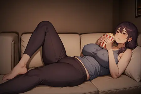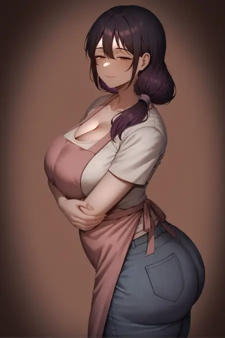 womanshiori, long hair,large breasts, low side ponytail,brown eyes,purple hair可选词: black hair,pregnant,messy hair,