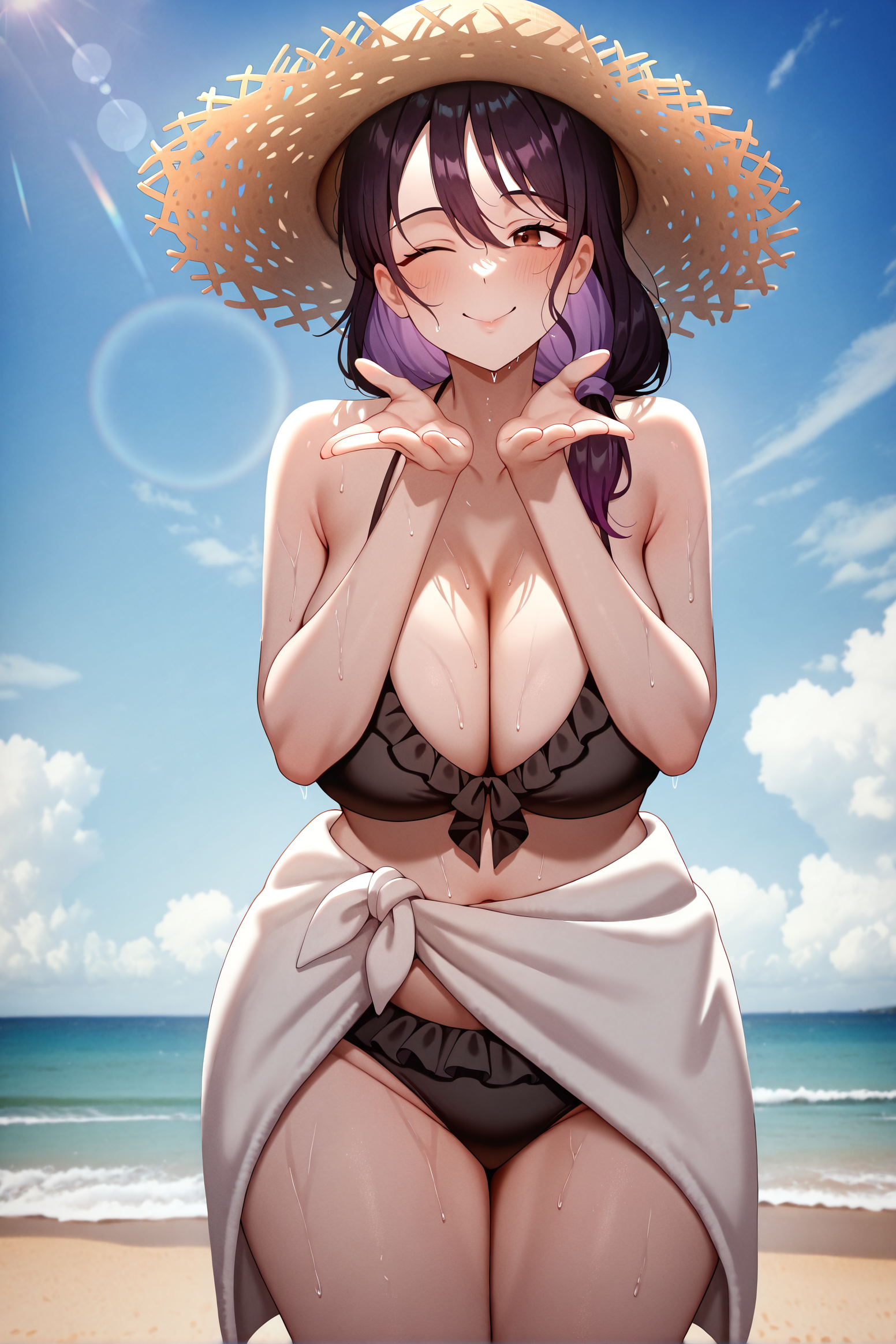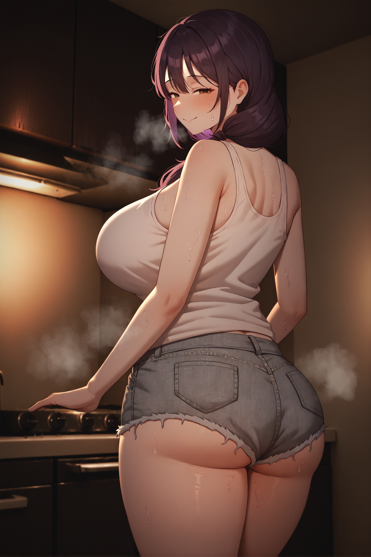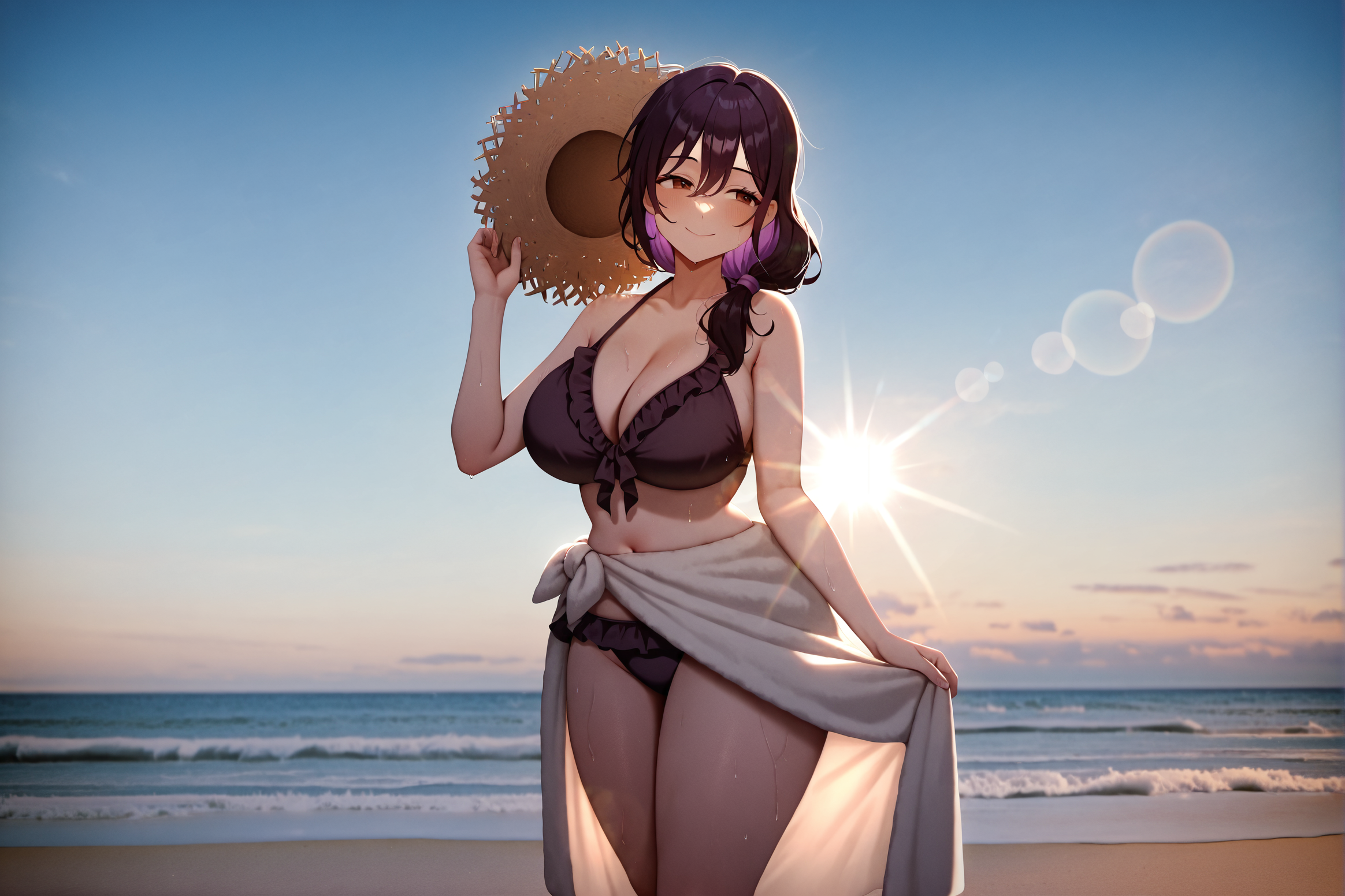 masterpiece,best quality,solo,film grain,vignetting,no lineart,womanshiori, long hair,large breasts, low side ponytail,brown eyes,purple hair,black hair,