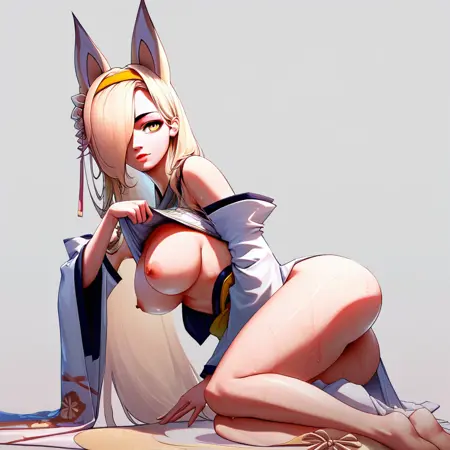 (Blue_Kaho, long hair, blonde hair, hair over one eye, yellow eyes, fox ears, hairband, japanese clothes, sideboob, detached sleeves, wide sleeves),