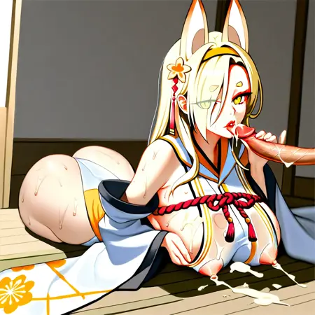 (Blue_Kaho, long hair, blonde hair, hair over one eye, yellow eyes, fox ears, hairband, japanese clothes, sideboob, detached sleeves, wide sleeves),