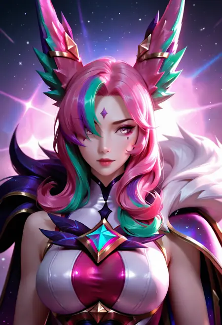 主要タグ: xayah, 1girl, 美しい顔, スターガーディアン \(リーグ・オブ・レジェンド\), ピンクの髪, 脸の模様, 長い髪, 多色の髪, 緑の髪, 紫の髪, 分かれた前髪, 二色の髪, 動物の耳, マント,