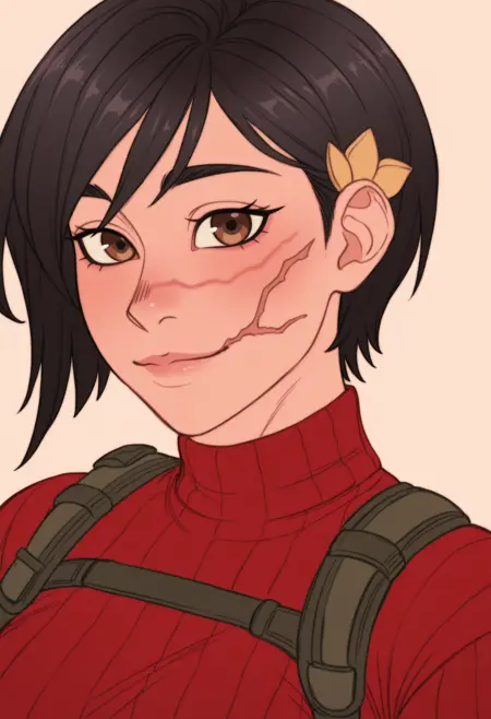Character Tags: scar on face, brown eyes, black hair, short hair, hair ornament, single mechanical arm
