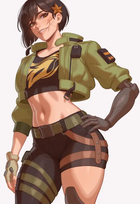 装束标签:绿色夹克,敞开式夹克,短款夹克,黑色衬衫,露脐上衣,腹部,肚脐,棕色手套,露指手套,黑色长裤,腰带,单侧义肢腿