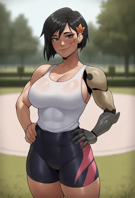 角色标签:棕色眼睛,黑发,短发,发饰,脸上有疤痕,单侧机械臂,单侧机械腿