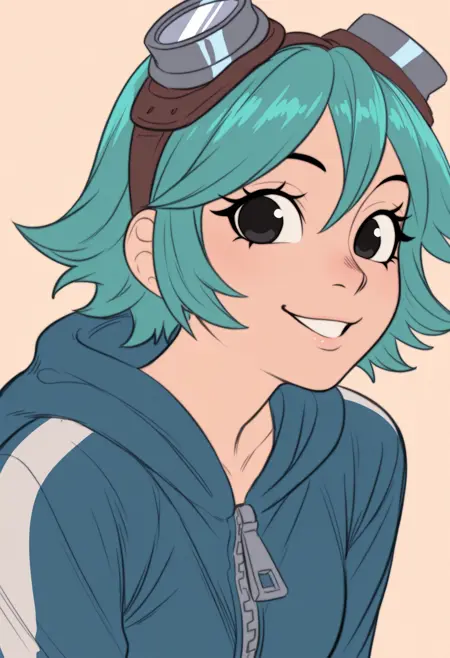Character Tags: aqua hair, short hair, black eyes, goggles on head