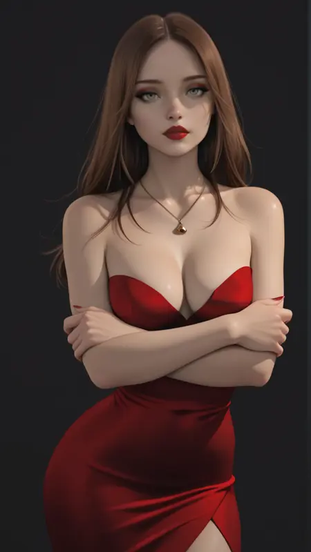 烟熏妆,猫眼妆,红色口红,链条项链,链条上挂青铜铃铛吊坠,红色连衣裙,无吊带连衣裙,深V领,乳沟,修身连衣裙,及膝长度连衣裙
