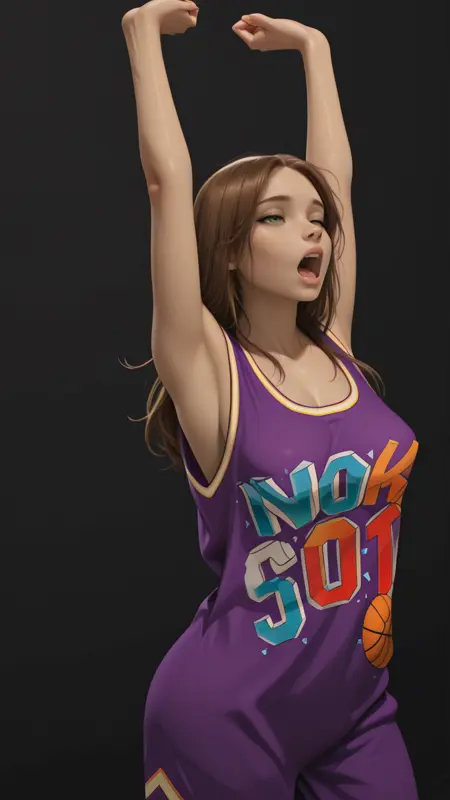 紫色运动衫,无袖,露肩,白色镶边,黄色镶边,方块字体,多色字体,浅蓝色字体,橙色字体,白色字体,红色字体,篮球图案,宽松运动衫