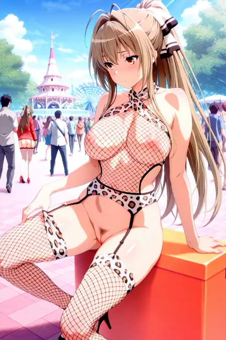 - leotard,animal print,thighhighs,nipples,breasts,navel,garter belt,fishnets,high_heels,