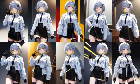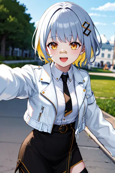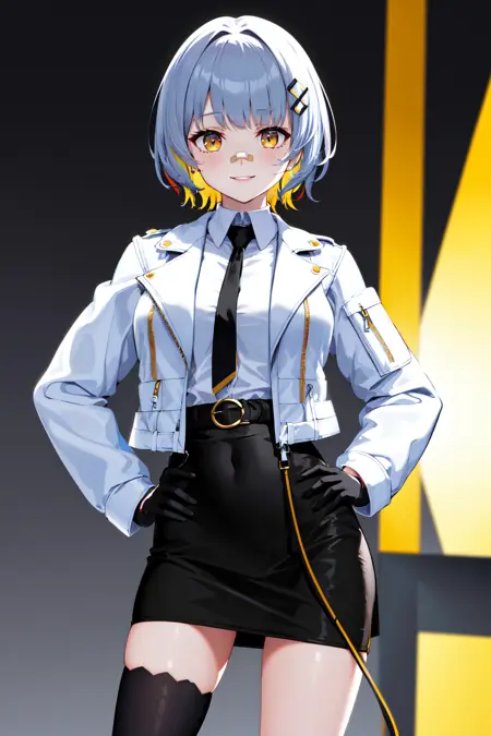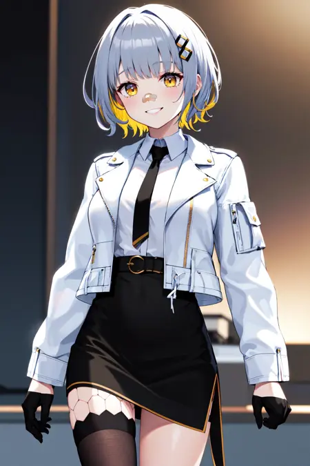 outfit2bbhachi, short hair, multicolored hair, hair ornament, bandaid on nose, white shirt, black necktie, white jacket, open jacket, cropped jacket, long sleeves, black gloves, black skirt, high-waist skirt, belt, single thighhigh