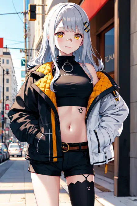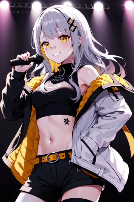 outfit1aahachi, long hair, hair ornament, bandaid on nose, crop top, black shirt, off shoulder, tattoo, (multicolored jacket:1.1), open jacket, long sleeves, midriff, belt, (black shorts:1.1), black thighhighs, single thighhigh