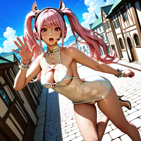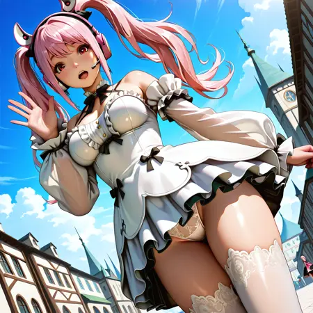 ホワイトチョーカー7481llu、胸、オフショルダー、フリル付きドレス、フリル、胸元、リボン、翼、取り外し可能な袖、エルボーグローブ、白いパンティ、シーホース、ハイヒール、
