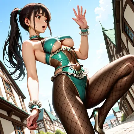 透け感のあるタイトドレス、サイドブーブ、胸元のカットアウト、パンティ、ハイヒール、