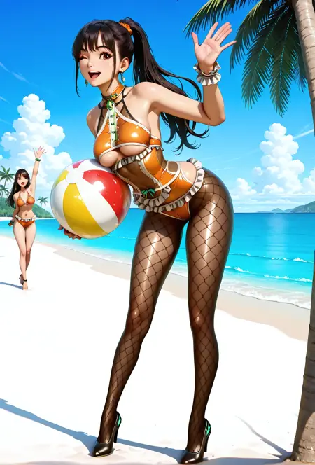 黒髪、ロングヘア、ポニーテール、茶色の目、イヤリング、