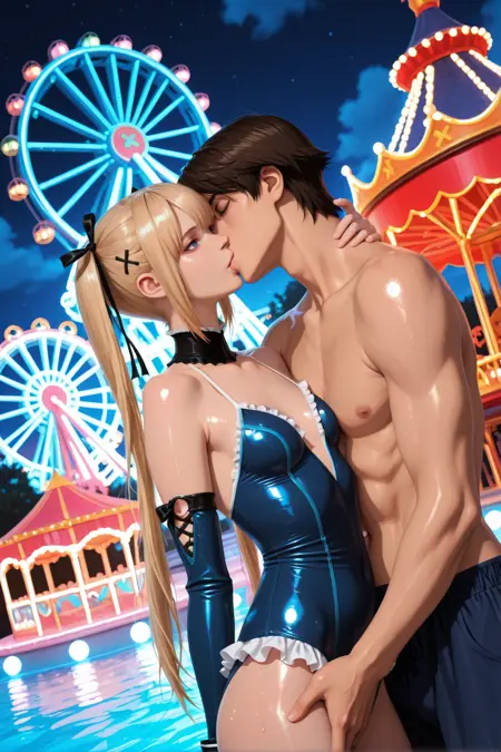 ilmarierose, マリー・ローズ, 1girl, 乳房, リボン, 青色のワンピース水着, ワンピース水着, フリル, フレンチキス, フリル付きワンピース水着, xヘアオーナメント, 青い目, キス, 黒いリボン, 1boy, 金髪, ヘアリボン, 水着, ツインテール, 抱きしめる, ヘアオーナメント, デタッチェッドスリーブ, ヘテロ, 他の人の胸をつかむ, 小さな乳房, 長い髪, 茶髪, 肩出し, ほほ赤らみ, 舌, ハイレグ水着, ボウタイ, ボウ, スーツ <lora:illustrious marie rose 1344x768:1>,