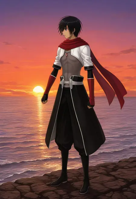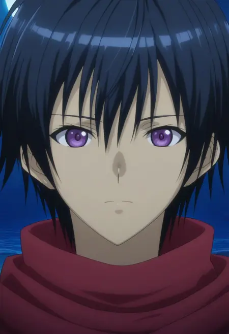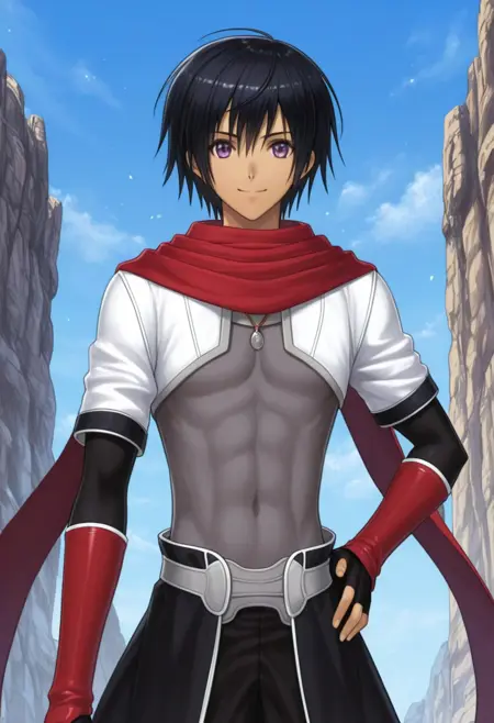 Rick Elwood, black-blue hair, purple eyes, long red scarf, necklace, white open cropped jacket, gray body fit undershirt, black fingerless elbow gloves, red vambraces, long black hip wear, black baggy pants, black knee boots