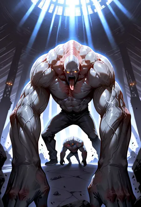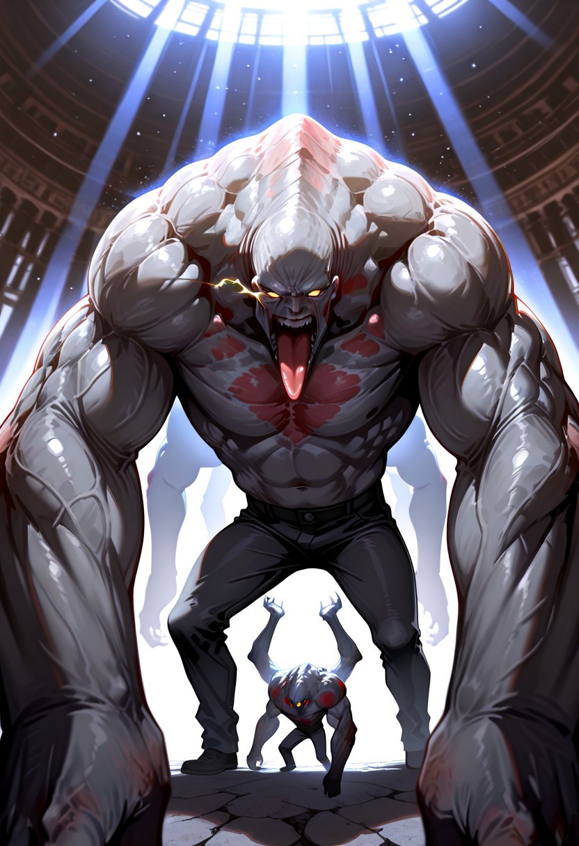 근육질이며 큰 배, 긴 팔, 근육질의 얇은 다리, 튀어나온 혀, 밝은 눈, 화난 표정, 벌어진 입