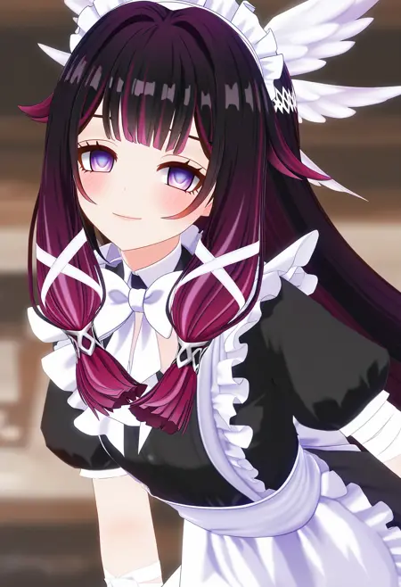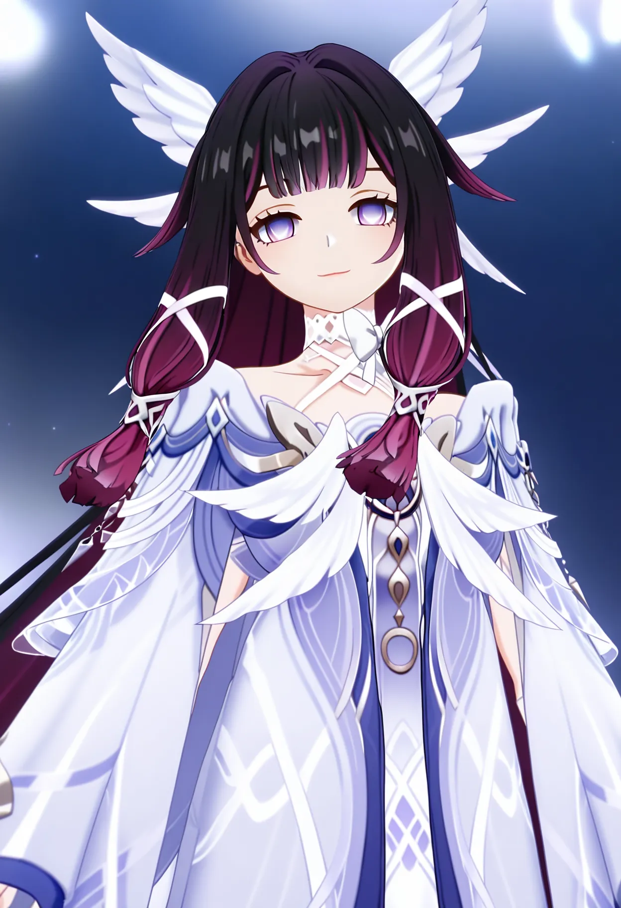 Columbina, eyes opened, 1girl, solo, dress, looking at viewer, purple eyes, black hair, wings, hair ornament, standing, head wings, closed mouth, white dress, wide sleeves, long sleeves, blunt bangs, sidelocks, wing hair ornament, upper body, soft smile