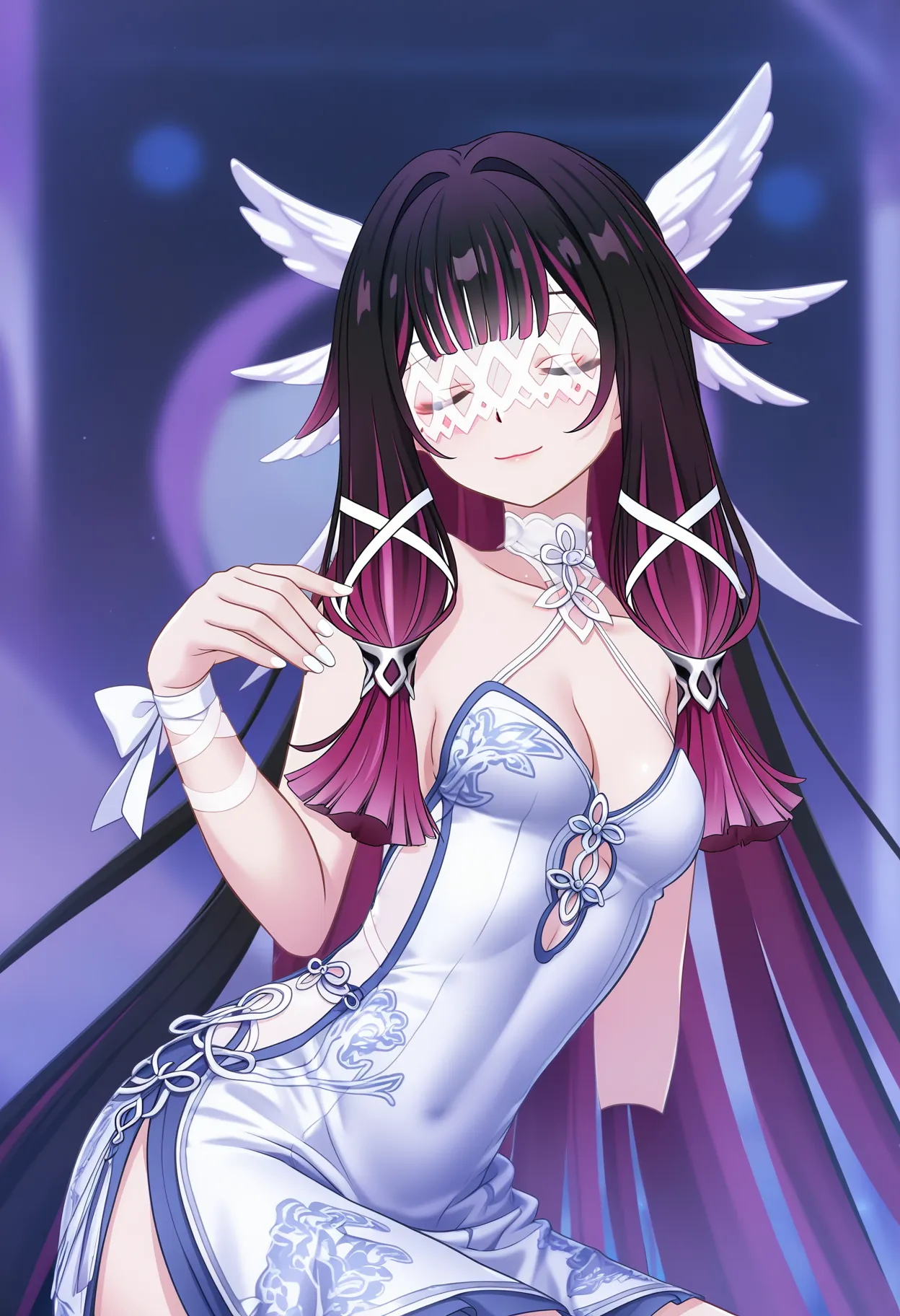 Columbina, eyes closed, eye mask, 1girl, 17-years-old girl, small breasts, dress, white dress, closed mouth, white nails, sleeveless, cleavage, bare shoulders, frills, sleeveless dress, bare arms, collarbone, clothing cutout, side slit, china dress, nail polish, chinese clothes, sideless outfit, multicolored hair, looking at viewer, Chinese style makeup, soft smile,