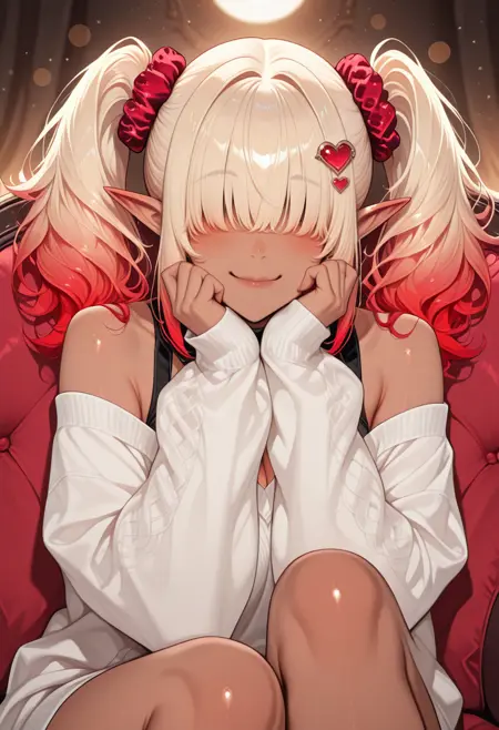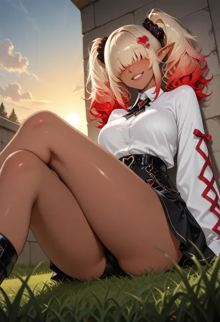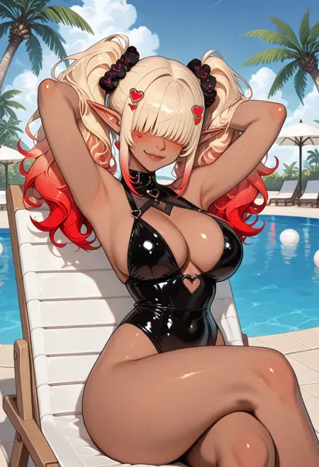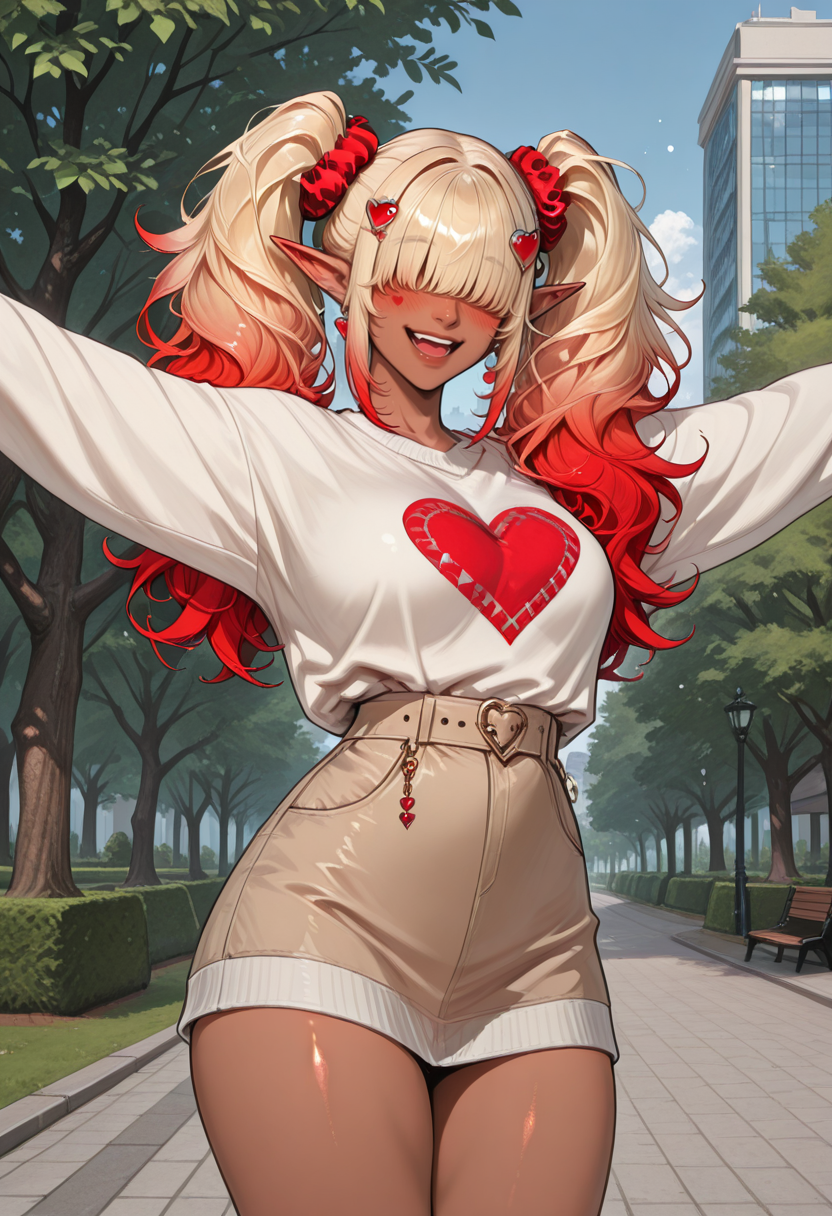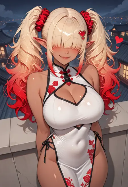 OCDRkElf, 1girl, hair over eyes, heart hair ornament, hair scrunchie, pointy ears, blonde hair, blunt bangs, multicolored hair, dark-skinned female, blonde hair, red hair, gradient hair