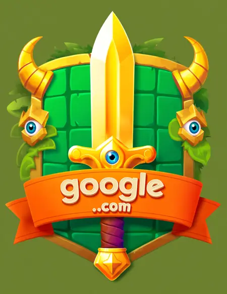 整体设计充满奇幻冒险风格,主体为一把明亮的金色长剑,剑刃锋利,手柄纹理清晰。绿色的方形元素环绕着剑身,形似城堡砖块或丛林植被。两侧配有金色角状装饰,增添仪式感。“google”采用浅米色粗体字,仿佛从石头上雕刻而出;“.com”位于一条橙色丝带上,字体醒目。整体配色鲜艳,金色、绿色与橙色协调统一,营造出中世纪城堡与冒险交织的氛围,仿佛在召唤人们踏上关于“史蒂夫城堡”的奇幻之旅。