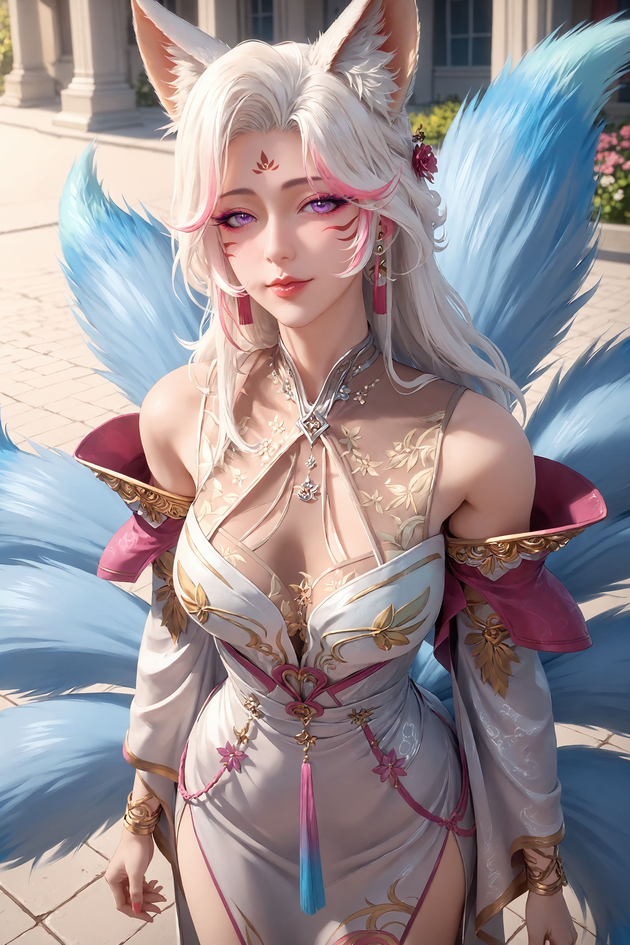 1girl,animal ears,facial mark,solo,multicolored hair,fox ears,white hair,long hair,pink hair,purple eyes,forehead mark,earrings,jewelry,whisker markings,bare shoulders,dress,multiple tails,blue tails