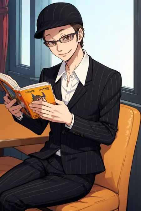 他的普通造型为:"西装、有领衬衫、条纹图案、眼镜、帽子、裤子"
