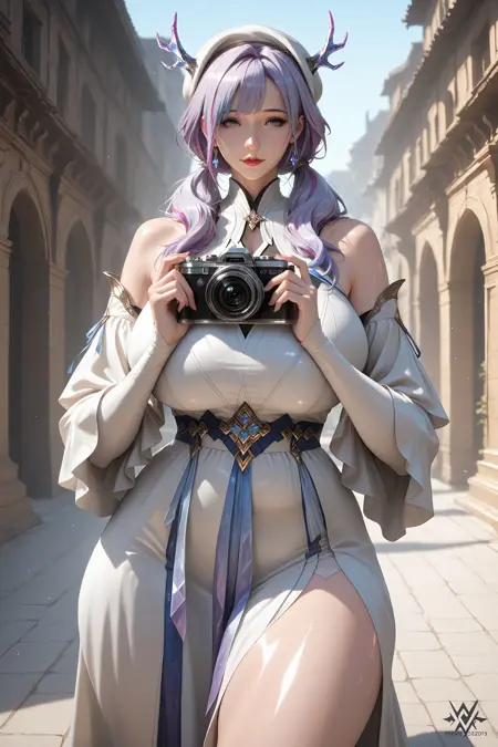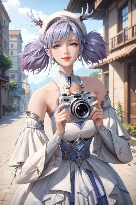 1girl, solo, twintails, dress, detached sleeves, purple hair, hat, blue eyes, multicolored hair, earrings, jewelry, horns,white dress,holding camera, holding