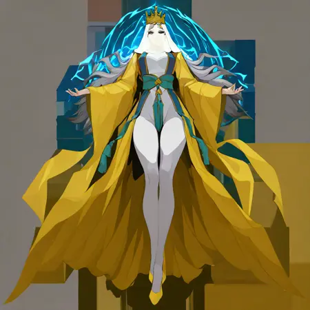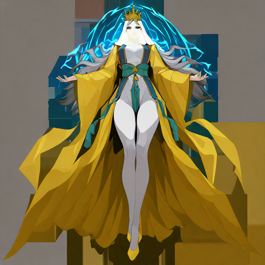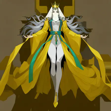 1girl, goddess-like, long flowing gray hair with dark tips, white see though mouth veil, yellow royal robe with wide sleeves and long ribbons, light purple inner bodysuit, green sash with blue tassel, mystical atmosphere, dynamic fabric flow, fantasy character design, majestic female, anime style, cel shading, detailed clothing folds,