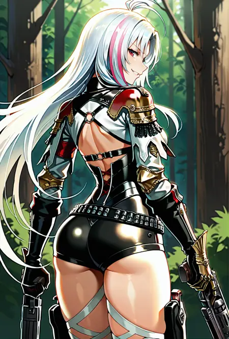 1girl, antenna hair, belt, blue eyes, gloves, handgun, holding gun, holster, long hair, red eyes, short shorts, solo, standing, thighhighs, white hair, pink streaked hair, corset,