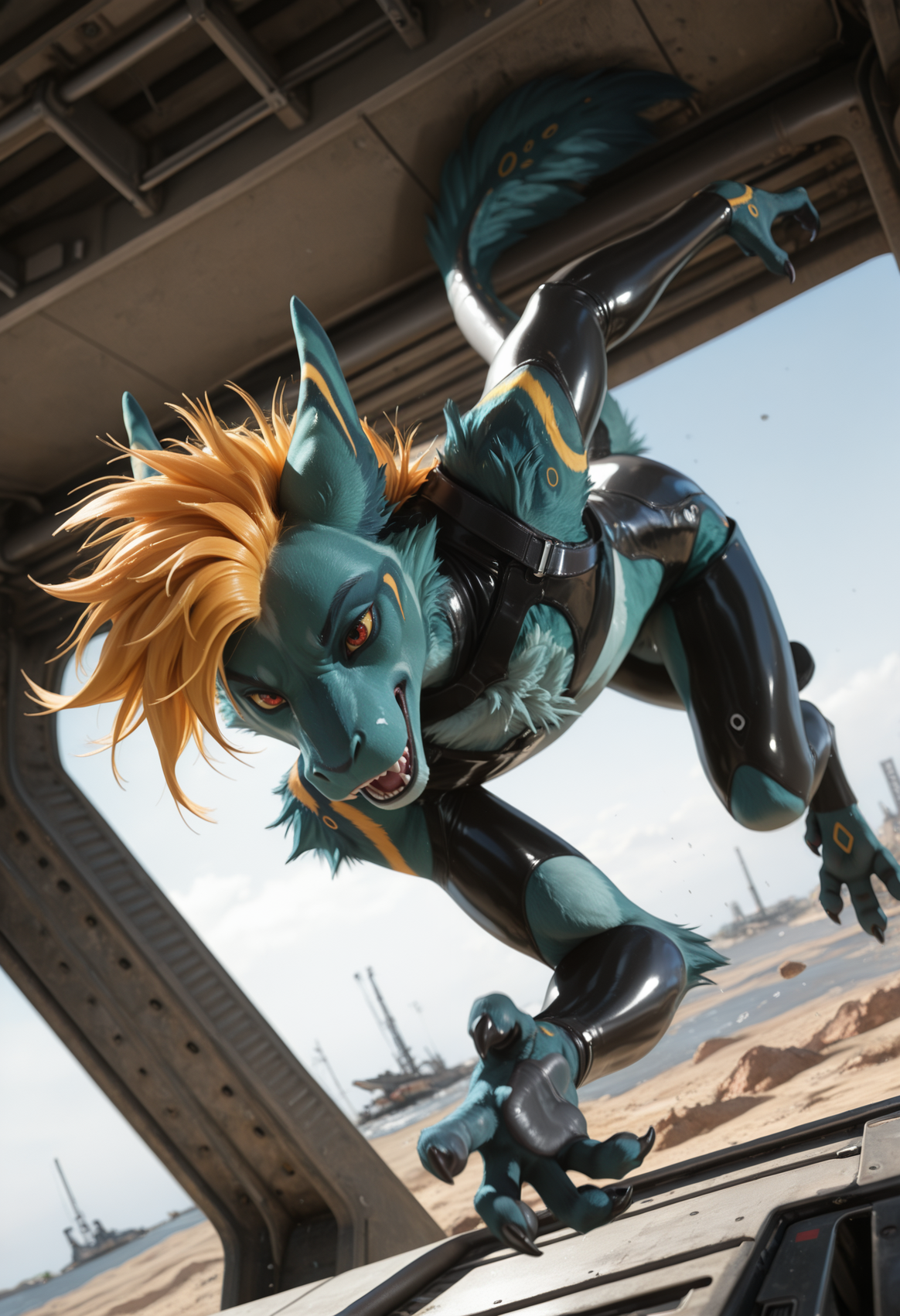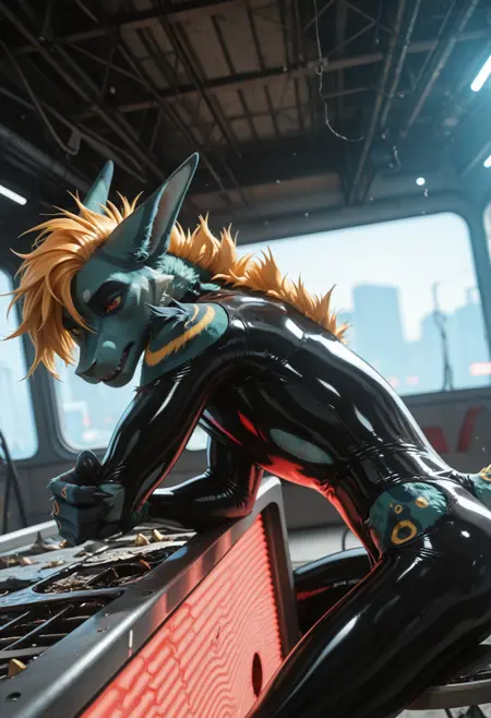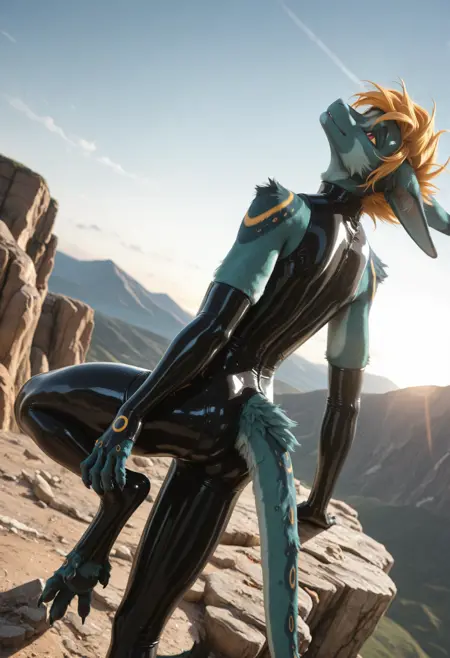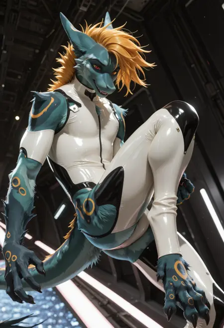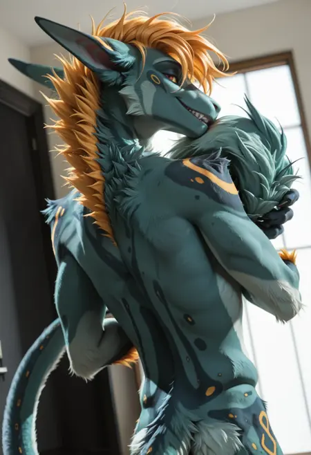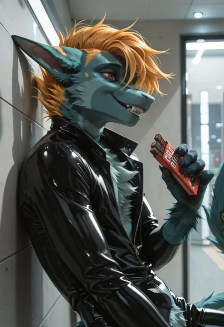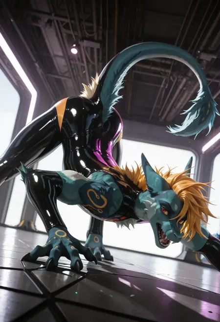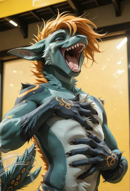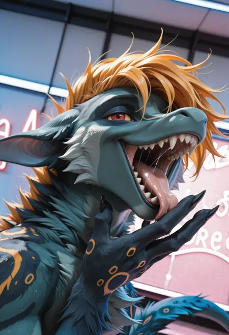 📝 Рокет — харизматичный фурри-дракон из JRPG-вселенной, созданный художником Underscore. Его узнают мгновенно: бирюзово-синяя кожа, яркая огненно-оранжевая грива и длинный, гибкий хвост с крупными кольцевыми отметинами. Рокет — воплощение стильного злодея: самоуверенный, язвительный, с ухмылкой, будто знает все твои слабости. Обожает монологи, драматические позы и внимание к себе, ненавидит, когда его перебивают. Часто носит чёрный латексный костюм с медными акцентами и кожаный плащ, подчёркивающий его плавную, мускулистую фигуру。
