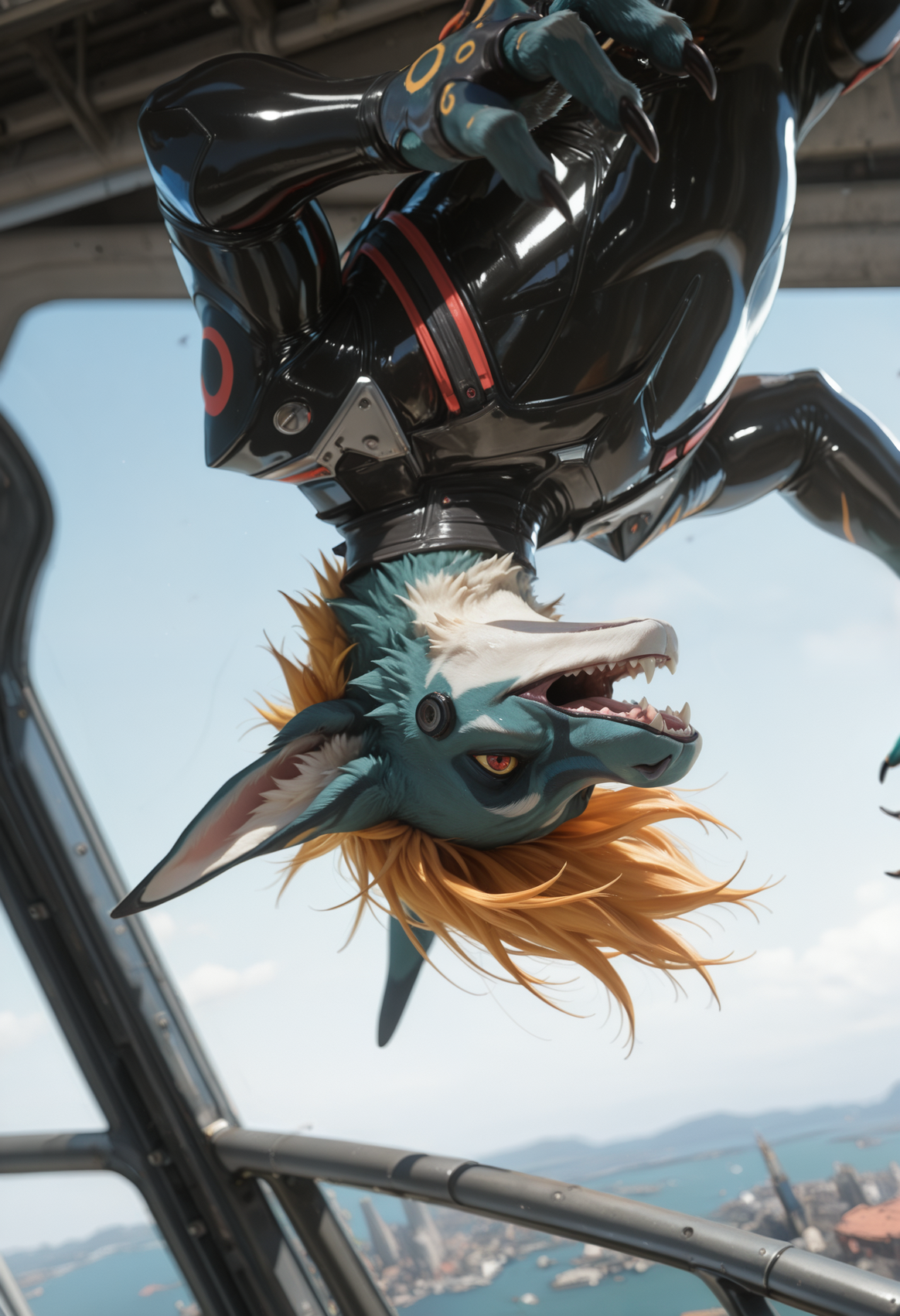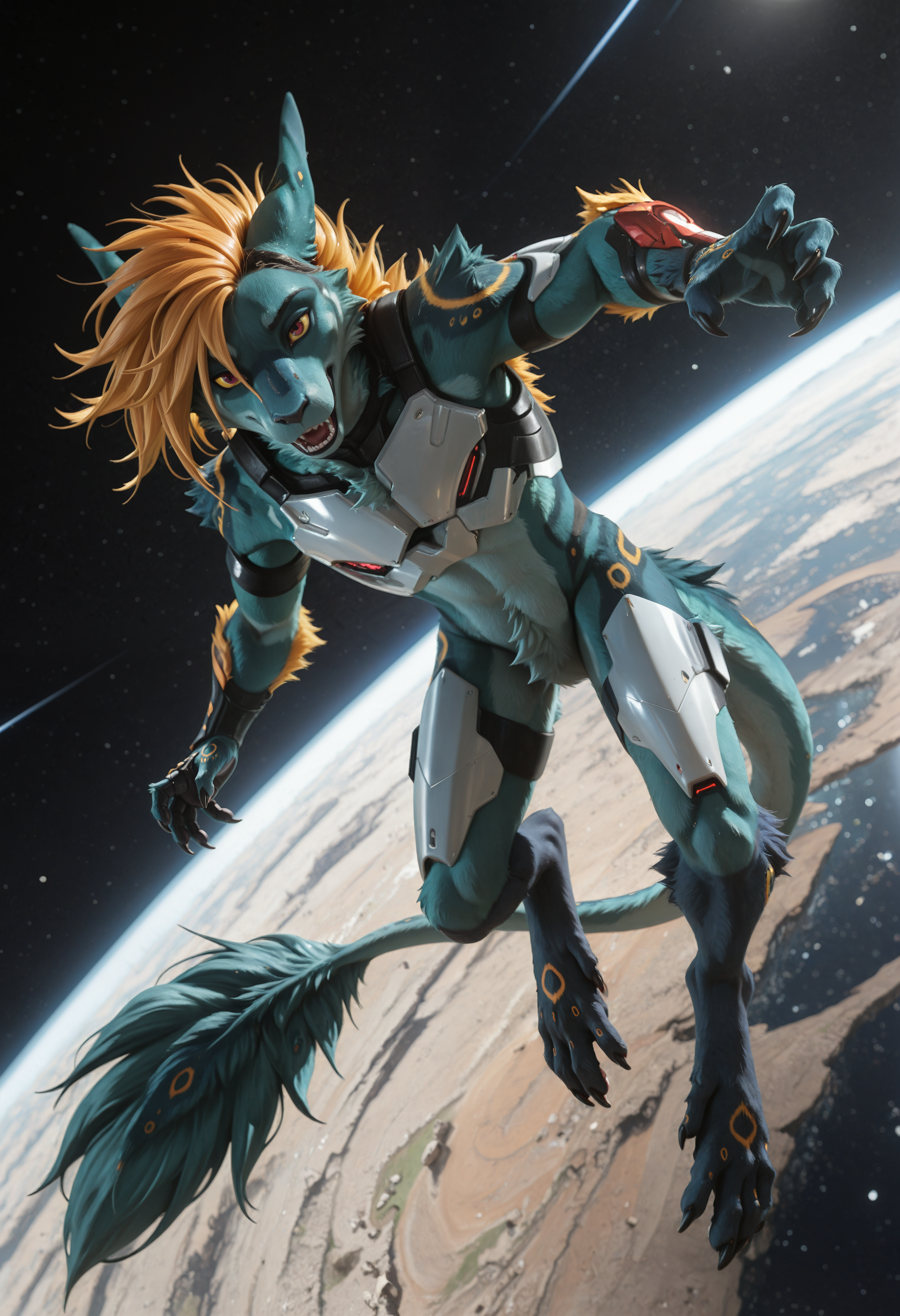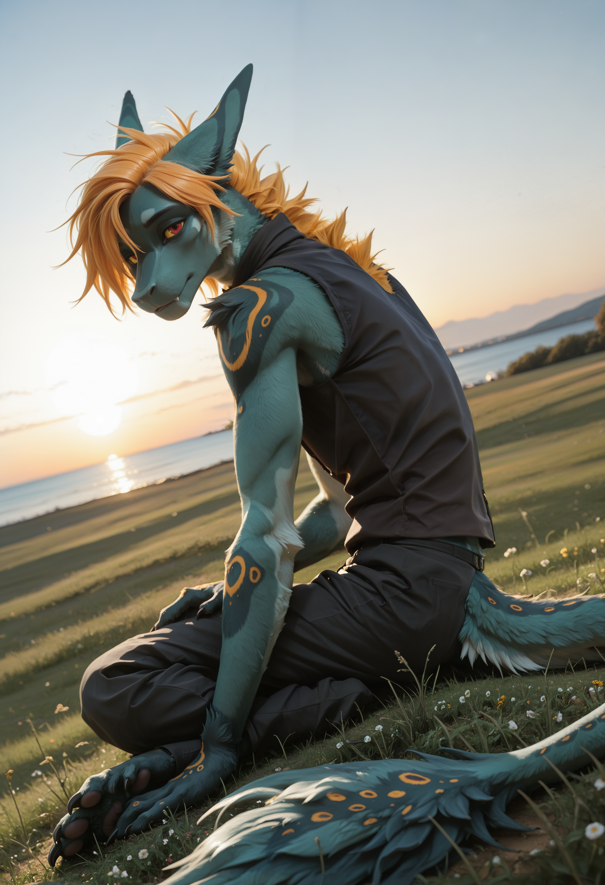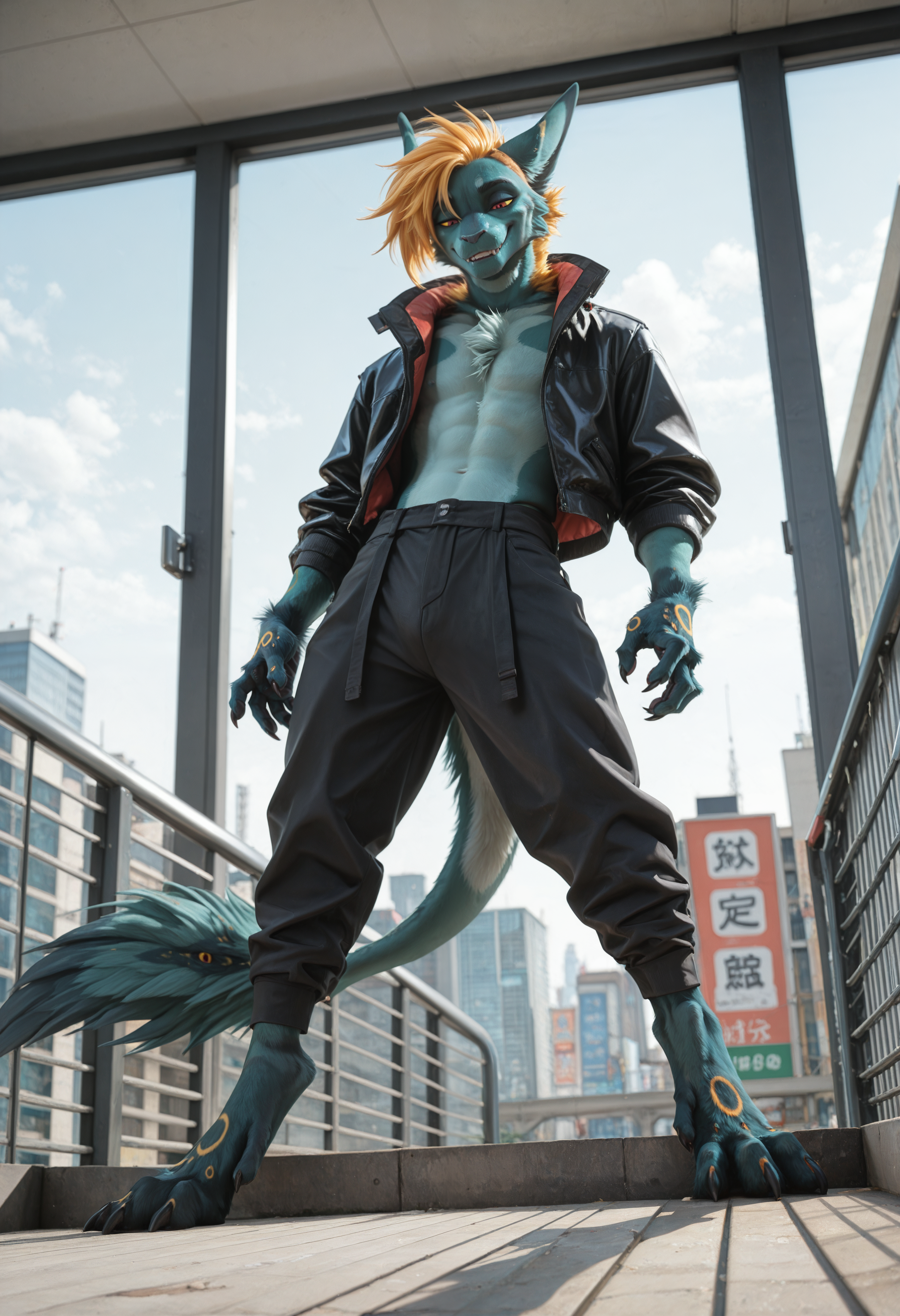 📝 Рокет — харизматичный фурри-дракон из JRPG-вселенной, созданный художником Underscore. Его узнают мгновенно: бирюзово-синяя кожа, яркая огненно-оранжевая грива и длинный, гибкий хвост с крупными кольцевыми отметинами. Рокет — воплощение стильного злодея: самоуверенный, язвительный, с ухмылкой, будто знает все твои слабости. Обожает монологи, драматические позы и внимание к себе, ненавидит, когда его перебивают. Часто носит чёрный латексный костюм с медными акцентами и кожаный плащ, подчёркивающий его плавную, мускулистую фигуру。