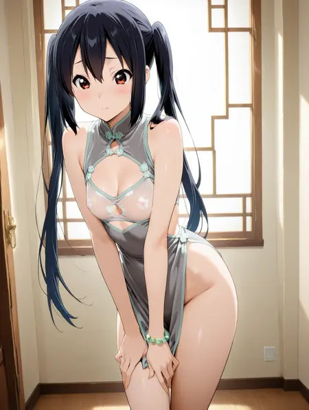 - china dress,breasts,grey dress,bracelet,jewelry,sleeveless,clothing cutout,sleeveless dress,bare shoulders,cleavage cutout,no panties,