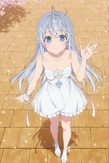 옷차림: h1b1k1, def, 1girl, 파란 눈, 회색 머리, 아호게, 긴 머리, 초커, 흰 드레스, 어깨 노출, 스트랩리스, 스트랩리스 드레스, 프릴 장식된 팔찌, 샌들