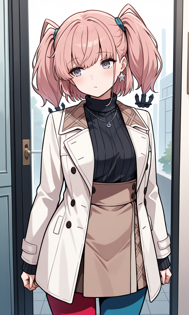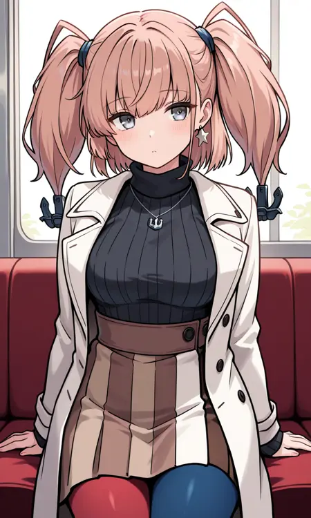 미츠코시 복장: atlantamtksKC, 회색 눈, 긴 소매, 보석, 투스타킹, 벌어진 옷, 목걸이, 양측 올림, 터틀넥, 흰 재킷, 리브 스웨터, 한쪽 귀걸이, 비대칭 하의, 허리 높은 치마, 갈색 치마, 터틀넥 스웨터, 흰 코트, 검은 스웨터, 어울리지 않는 하의, 별 귀걸이, 닻 머리 장식, 줄무늬 치마, 빨간 투스타킹, 파란 투스타킹, 체크 칼라,