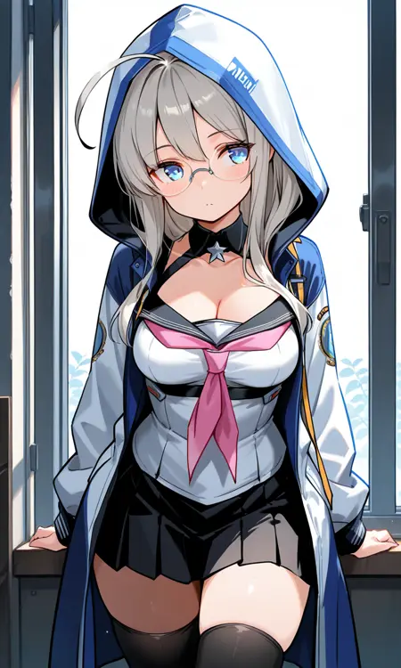 Rain Outfit (Weight 1.0) : heywoodKC,grey hair,blue eyes, long hair, long sleeves, thighhighs, cleavage, white shirt, ahoge, pleated skirt, glasses, serafuku, black thighhighs, black skirt, black sailor collar, pink neckerchief, miniskirt, zettai ryouiki,shirt collar,medium breasts,hooded coat,open coat,hood up,two tone coat,
