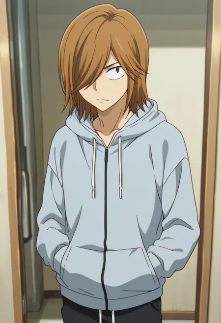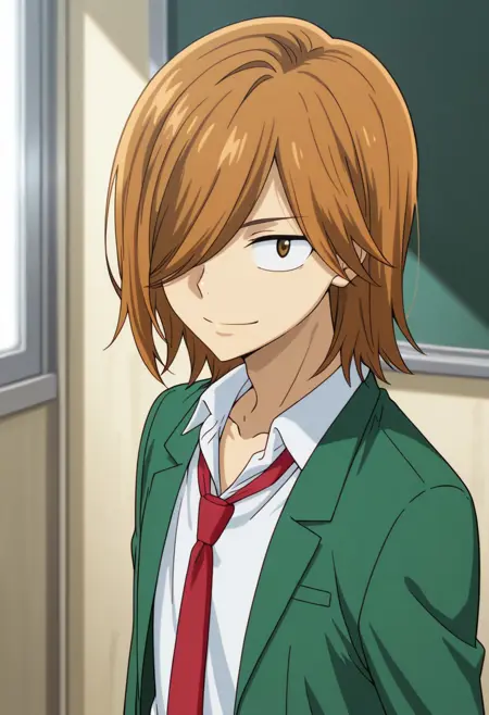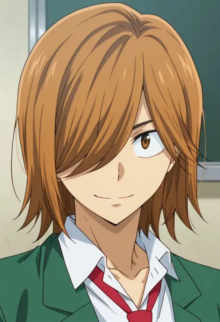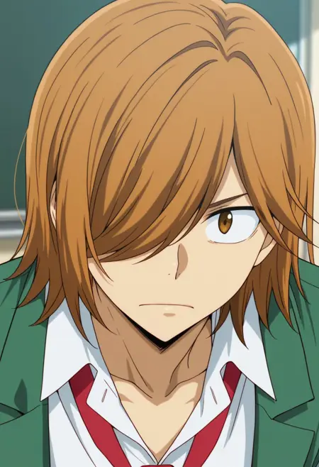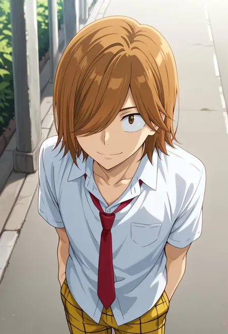 1boy, male focus, solo, brown eyes, brown hair, hair over one eye, school uniform, white shirt, collared shirt, collarbone, red necktie, green jacket, yellow pants, plaid pants,