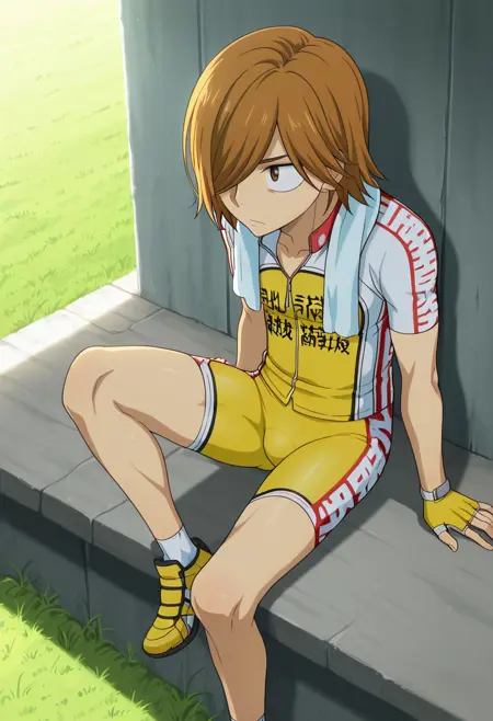 1boy, male focus, solo, brown eyes, brown hair, hair over one eye, cycling uniform, white and yellow shirt, collarbone, short sleeves, yellow gloves, fingerless gloves, yellow shorts, bike shorts, white socks, shoes, yellow footwear,