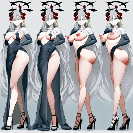 (Blue_Makoto, long hair, grey hair, blue eyes, hair over one eye, pointy ears, halo, jewelry, earrings, dress, gloves, high heels),