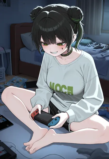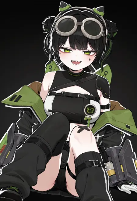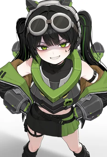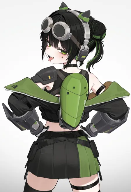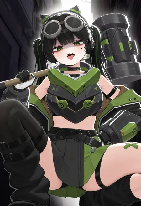 | 训练词汇 | black hair, green hair, short hair, streaked hair, double bun, twintails, green eyes, goggles on head, headphones, animal ear headphones, bangs, teardrop tattoo, choker, jetpack, black shirt, multicolored shirt, sleeveless shirt, midriff, chest belt, shoulder belt, badge, clothing cutout, single shoulder pad, arm belt, green jacket, multicolored jacket, gauntlets, multicolored gloves, crossed belts, black skirt, green skirt, multicolored skirt, thigh belt, bandaid on leg, black thighhighs, black kneehighs, uneven legwear, black legwarmers, leg belt, black footwear已复制! black hair, green hair, long hair, streaked hair, twintails, green eyes, goggles on head, headphones, animal ear headphones, bangs, teardrop tattoo, choker, jetpack, black shirt, sleeveless shirt, chest guard, midriff, green jacket, multicolored jacket, arm belt, gauntlets, multicolored gloves, crossed belts, black skirt, green skirt, multicolored skirt, thigh belt, bandaid on leg, black thighhighs, black kneehighs, uneven legwear, black legwarmers, leg belt, black footwear, sledgehammer,已复制! |