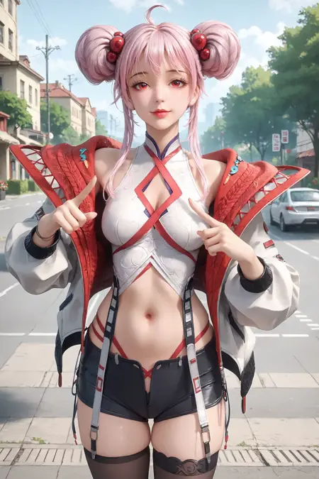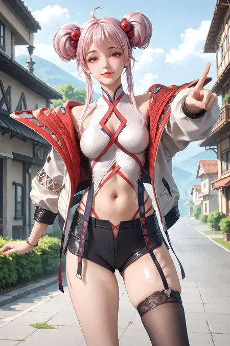 1girl, red eyes, solo, pink hair, double bun, jacket, hair bun, ahoge, hair ornament, sidelocks, open jacket, hair bobbles, open clothes, shorts, thighhighs, single thighhigh, navel, pointing, short shorts,