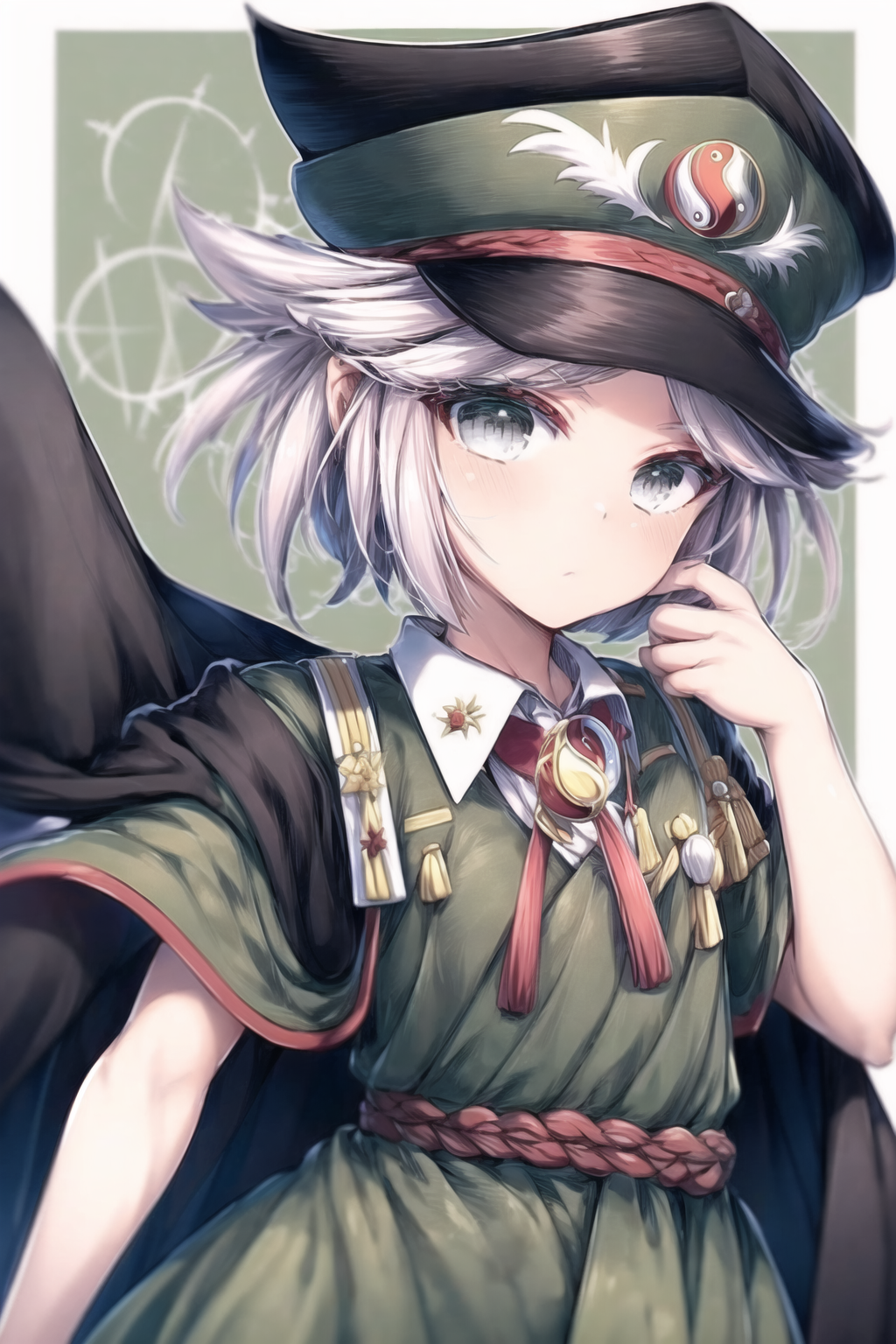 fujiwara no shirogane no sanra, white hair, grey hair, boots, androgynous, military hat, green dress, military uniform, short hair, black cape, yin yang \(ornament\), collared shirt