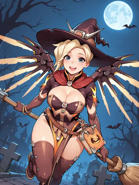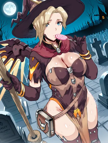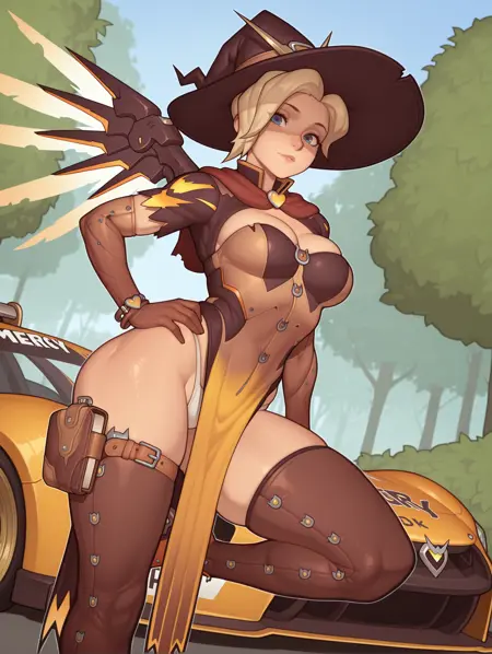 外見:ウィッチマーシーコフ、マーシー(オーバーウォッチ)、青い目、金髪、魔女帽、肘まで手袋、本ホルスター、カプレット、太ももまでフィットする靴下、短い袖、ブレスレット、骨盤カーテン、胸元の露出