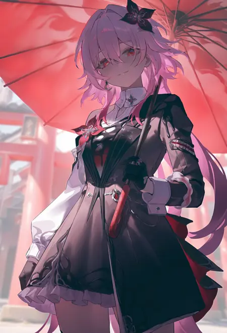 トリガー語:evernight,1girl,black gloves,hair between eyes,hair ornament,long hair,pink hair,red eyes,long sleeves,hair flower,black dress,umbrella,jewelry,single earring,jacket,asymmetrical sleeves,white shirt,multicolored clothes,