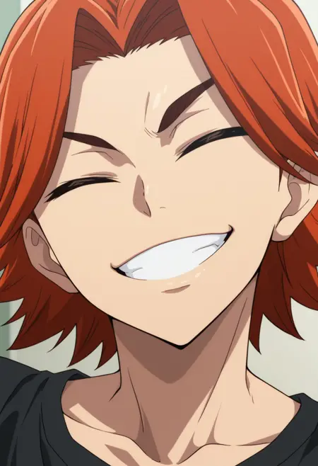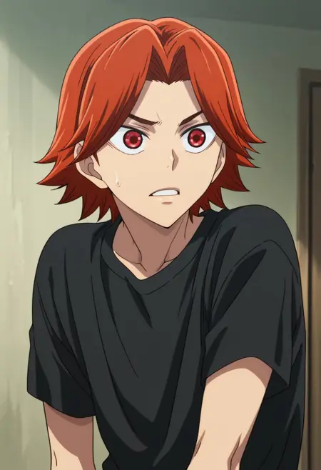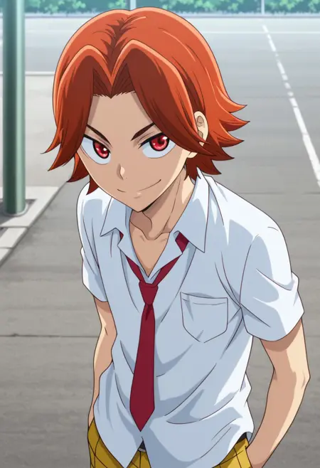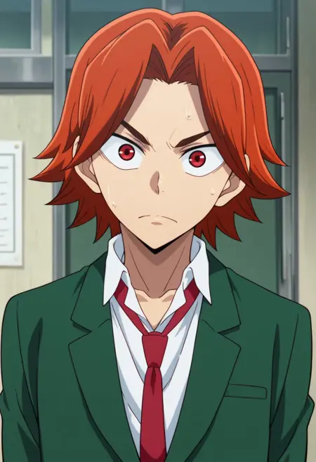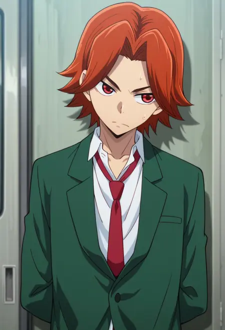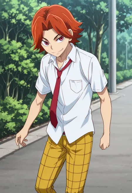 1소년, 남성 중심, 싱글, 빨간 눈, 주황색 머리, 교복, 흰색 셔츠, 칼라 셔츠, 목뼈, 빨간 넥타이, 녹색 재킷, 노란색 바지, 체크 무늬 바지,