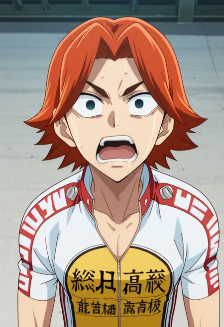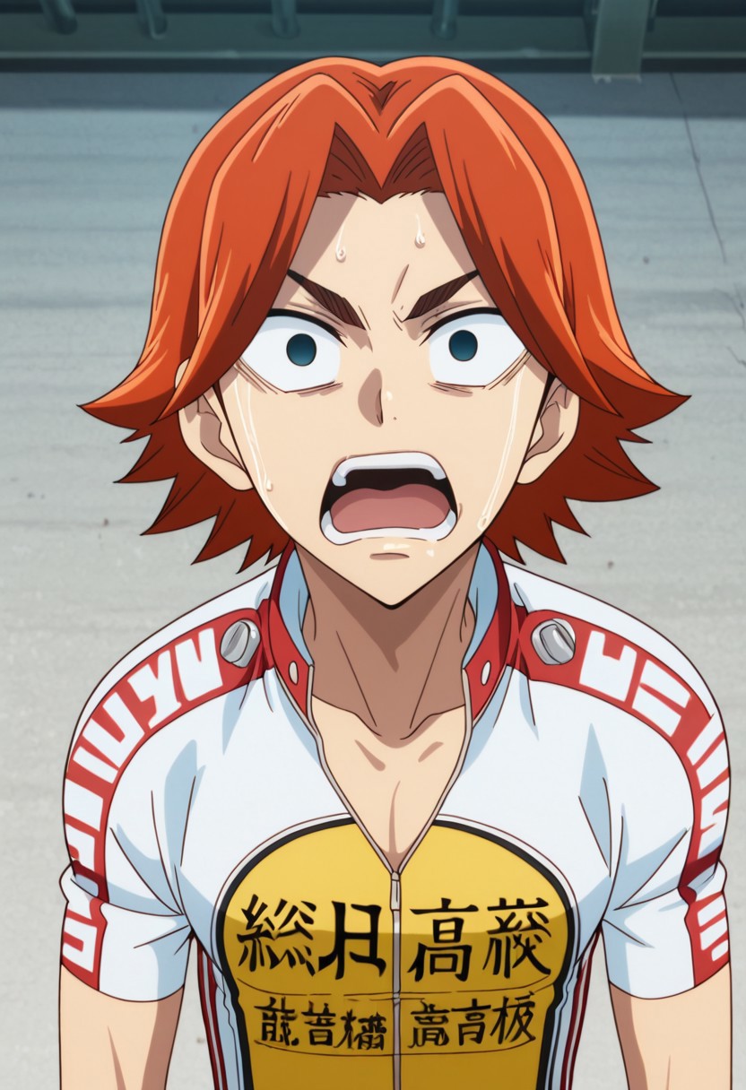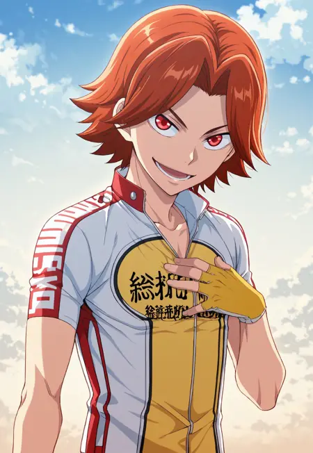 1소년, 남성 중심, 싱글, 빨간 눈, 주황색 머리, 자전거 경기복, 흰색 및 노란색 셔츠, 목뼈, 반팔, 노란색 장갑, 손가락 없는 장갑, 노란색 반바지, 자전거 반바지, 흰색 양말, 신발, 노란색 신발,