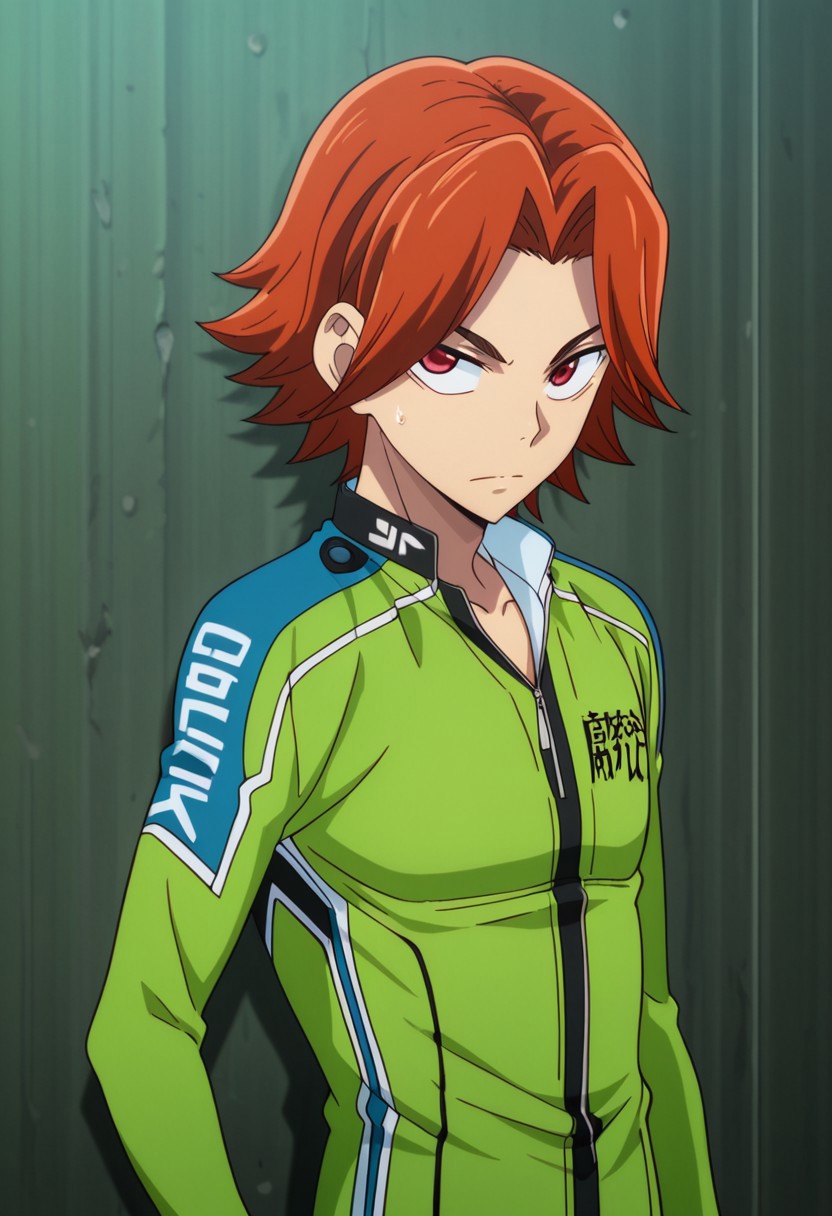 1소년, 남성 중심, 싱글, 빨간 눈, 주황색 머리, 자전거용 변형 복장, 녹색 및 파란색 셔츠, 목뼈, 긴팔, 녹색 장갑, 손가락 없는 장갑, 녹색 반바지, 자전거 반바지,