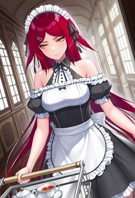 衣装4(メイド服):maid, maid headdress, hair ornament, white puff sleeve band, apron, hairclip, frills, bow, ribbon, bare shoulders