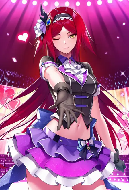 服装10(偶像):偶像, 手套, 裙子, 发带, 肚脐, 黑色手套, 短袖, 领结, 发饰