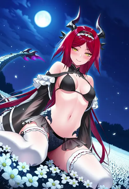 衣装12(追加):thighhighs, dragon tail, horns, white thighhighs, black triangle bikini top, navel, black sleeves past the wrists, black long sleeves, black wide sleeves, ruffles, headband, off the shoulders, skirt that only covers the sides, dragon scale panties,